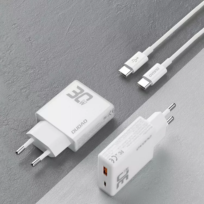 GaN Dudao A30EUT 30W USB-A / USB-C Vägghybrider - Vit + USB-C - USB-C Kabel