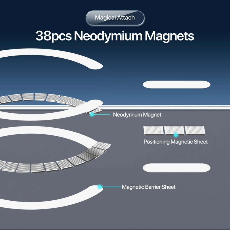 - Starka Neodymium-magneter: 38 stycken neodymium-magneter förstärker den magnetiska anslutningen för effektiv laddning.