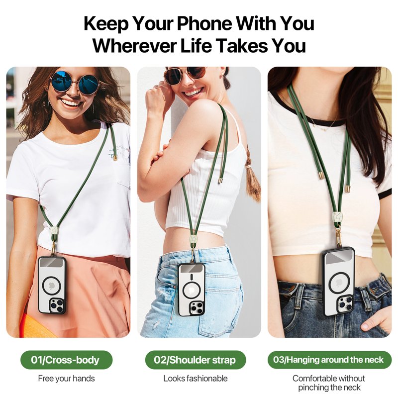- Justerbar längd: Anpassa remmen som axelrem, crossbody-rem eller nackrem för optimal komfort.