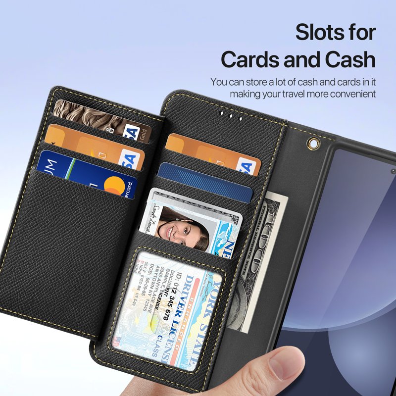 - Flera förvaringsalternativ: Fodralet har en zip-ficka och flera kortfack för kontanter och kort.