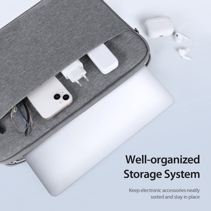 - Framficka för förvaring av tillbehör som pennor, kablar och mobiltelefoner
