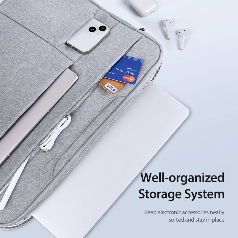 - Flera fickor: Utformad med flera fickor för enkel förvaring av laptop och elektroniska tillbehör.