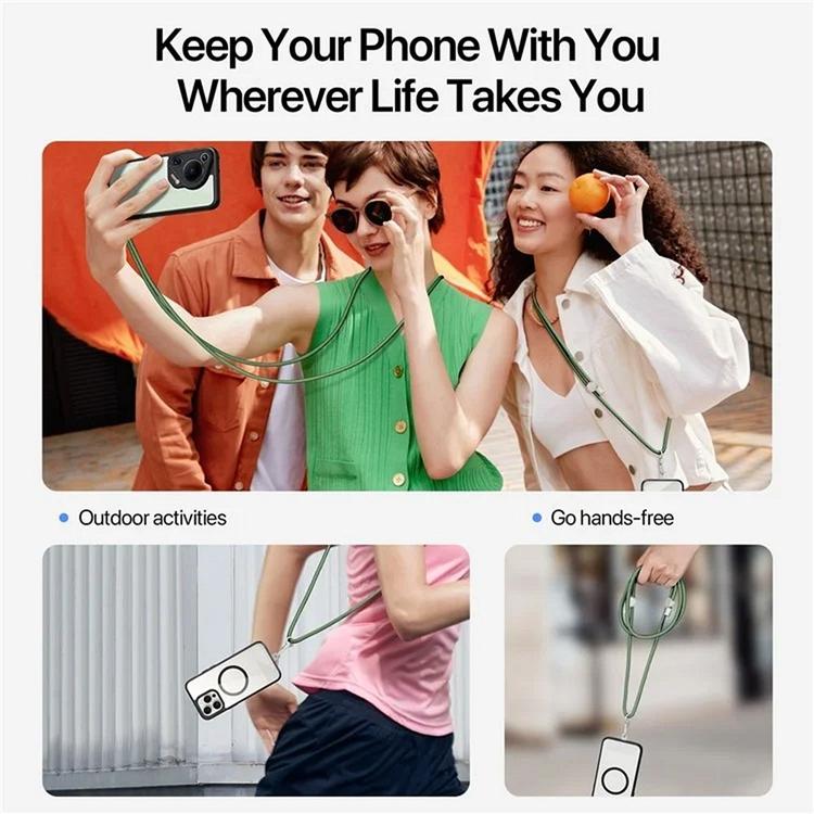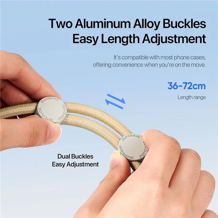 Tillverkad av slitstarka material som zinklegering, TPU och polyester, är denna mobilrem både tålig och bekväm. De två aluminiumspännena ger ett stadigt grepp och säkerställer att din mobil hålls på plats utan risk för fall. Den minimalistiska och stilrena designen gör den till ett snyggt tillbehör som passar alla outfits, samtidigt som den erbjuder en praktisk och säker lösning för att bära din mobil.