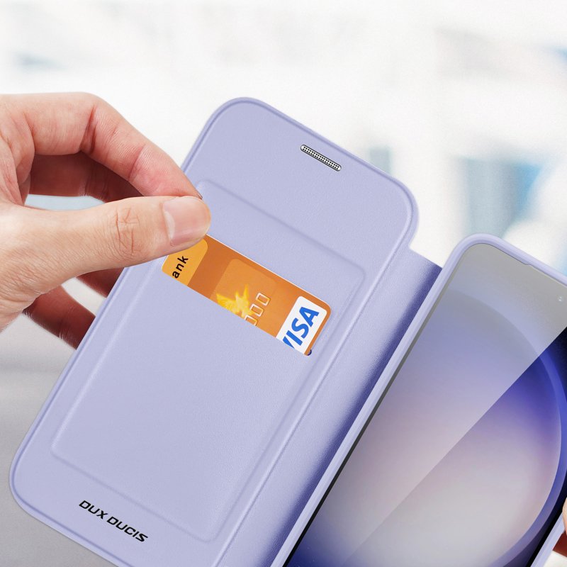Upptäck DUX DUCIS Samsung Galaxy S24+ fodral i äkta läder. Detta fodral erbjuder både stil och funktionalitet. Med sin eleganta design och smarta funktioner skyddar det din telefon samtidigt som det ger enkel åtkomst till dina kort. Perfekt för den moderna användaren.
