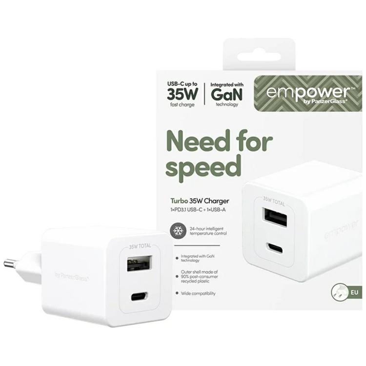 Empower by PanzerGlass Turbo 35W USB-C + USB-A är ett smart val för dig som vill ha snabb, säker och flexibel laddning – oavsett om du är hemma eller på språng.