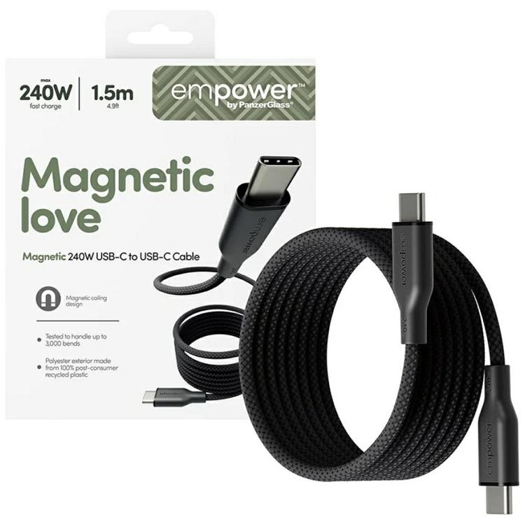 Empower by PanzerGlass Magnetic USB-C till USB-C kabel 240W är det självklara valet för dig som vill ha kraftfull laddning, smart förvaring och premiumkänsla – varje dag.