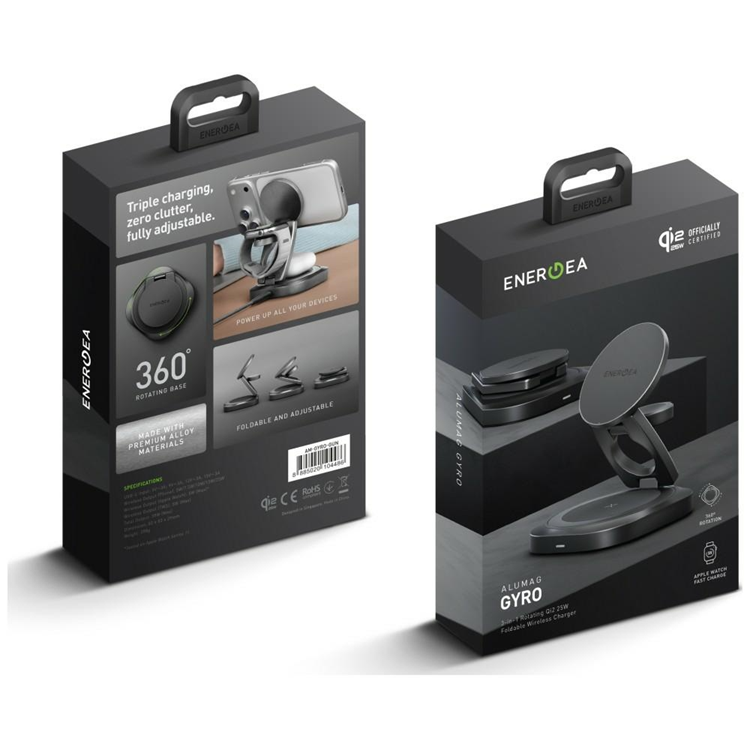 Energea Qi2.2 MagSafe Trådlös Laddare För iPhone/Apple Watch/Airpods Alumag GYRO 360 - Gunmetal