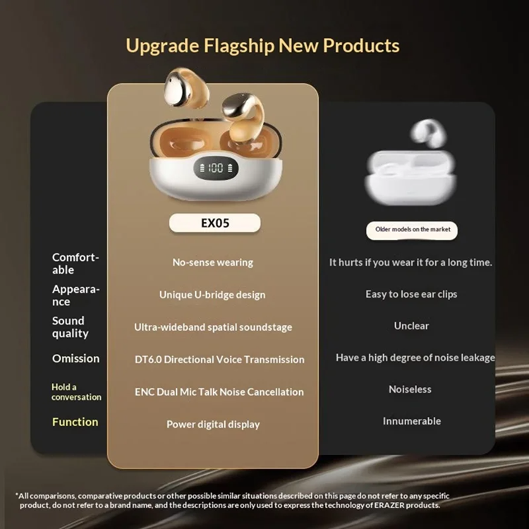 ERAZER EX05 är trådlösa open ear-hörlurar för dig som vill njuta av musik, samtal och träning utan att stänga ute omgivningen. Den smarta clip-on-designen ger en lätt och bekväm passform som sitter stabilt även under rörelse, samtidigt som den minskar trycket i öronen vid längre användning. Med tydligt ljud, klara samtal och ett laddningsetui med digital batterivisning blir vardagen enklare och mer flexibel. Oavsett om du springer, pendlar eller arbetar får du en lyssningsupplevelse som känns fri, säker och bekväm hela dagen. ERAZER EX05 kombinerar stilren design med praktisk funktion för en modern och aktiv livsstil.