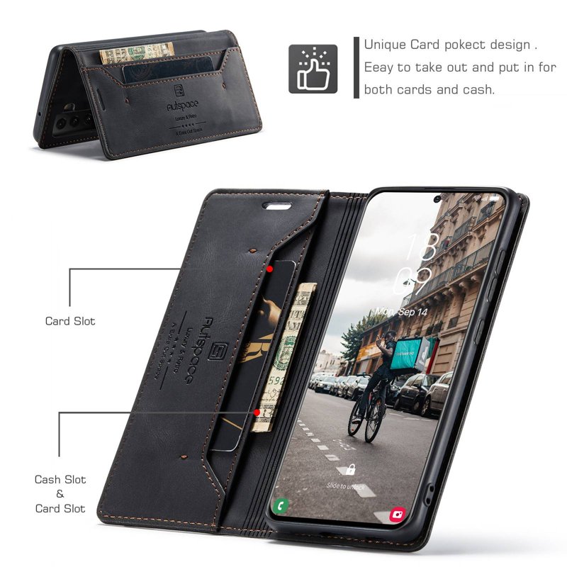 Upptäck AUTSPACE A01 fodral för Samsung Galaxy S21 FE 5G. Detta fodral kombinerar stil och funktionalitet. Tillverkat av PU-läder och en mjuk TPU-inre del ger det en behaglig känsla. Med RFID-blockering skyddar det din personliga information. Perfekt för den moderna användaren.