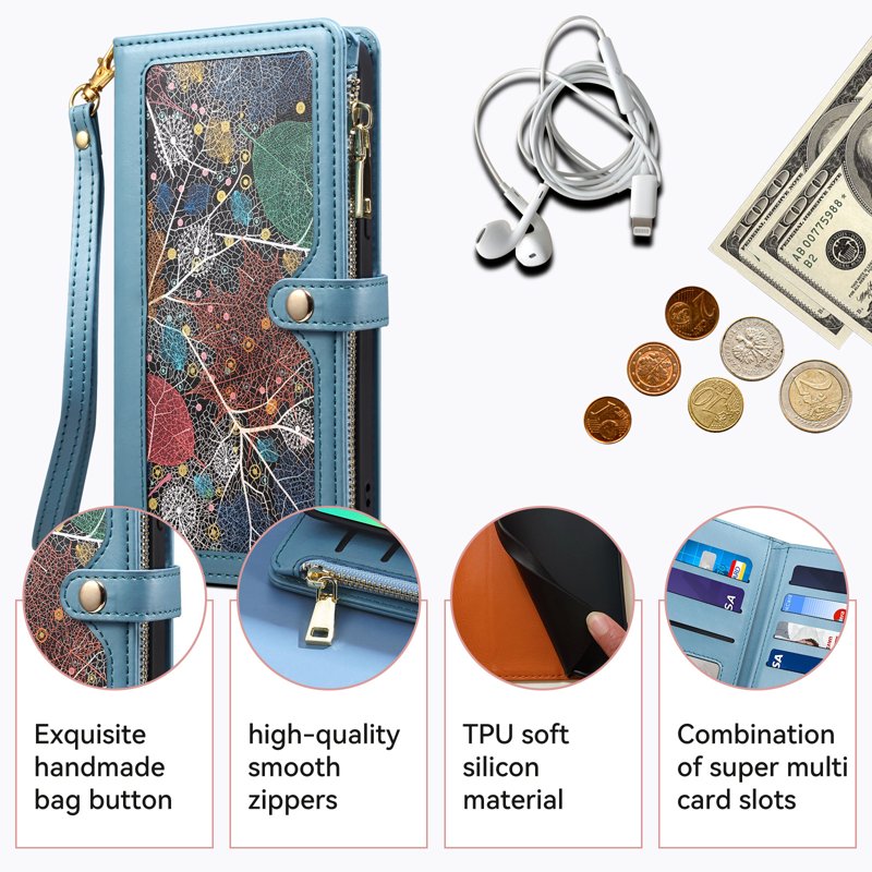 - Inkluderar 8 kortfack, ett sedelfack och en dragkedjeficka för mynt och kontanter.