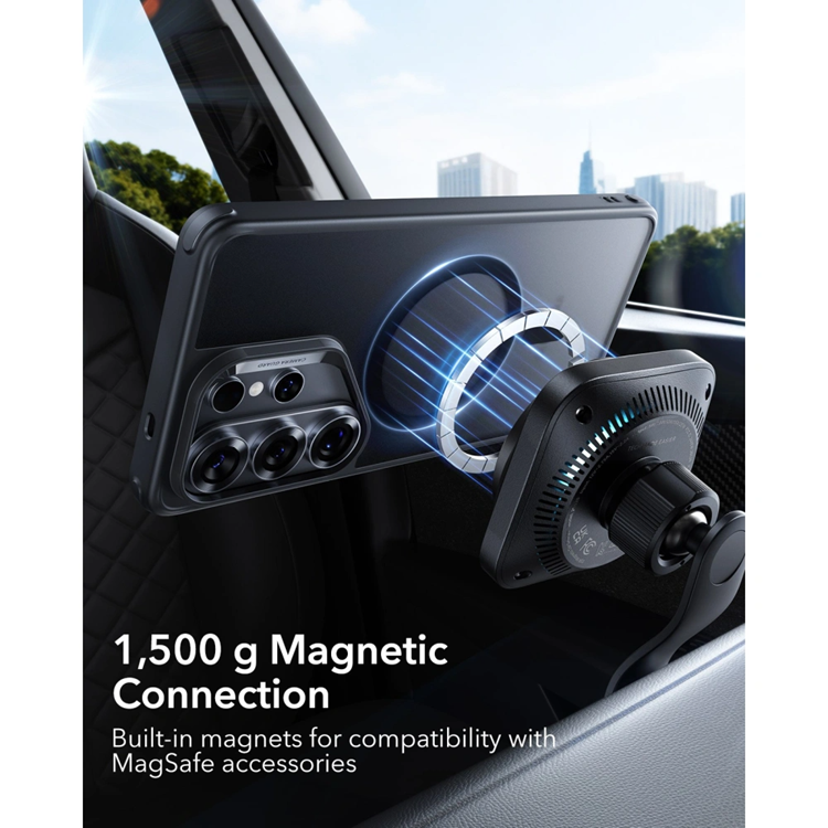 Fodralet har en inbyggd MagSafe-kompatibel magnetring, som säkerställer maximal trådlös laddningseffektivitet och en säker anslutning till alla MagSafe-tillbehör. Designen har genomgått militärklassade tester, och de specialdesignade Air Guard-hörnen absorberar stötar och skyddar telefonen vid fall.