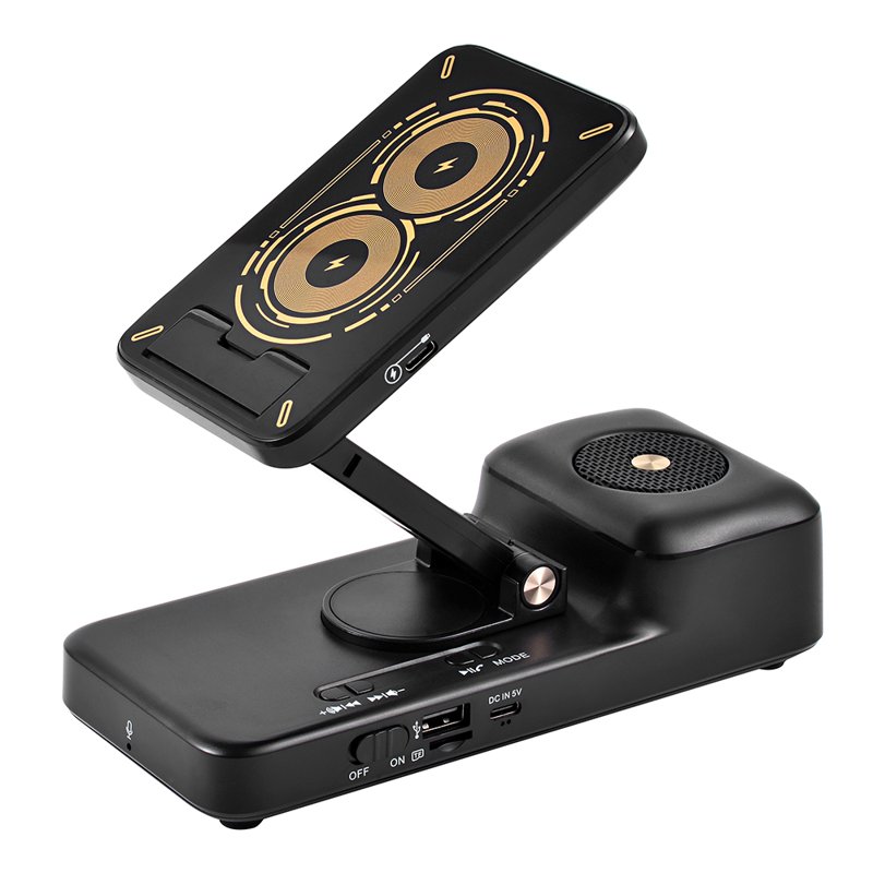Detta trådlösa laddningsställ är perfekt för både smartphones och tablets. Med justerbar höjd och vinkel samt 360-graders rotation kan du enkelt hitta den bästa positionen. Den robusta konstruktionen ger stabilitet och hållbarhet. Njut av trådlös laddning och musikuppspelning samtidigt.