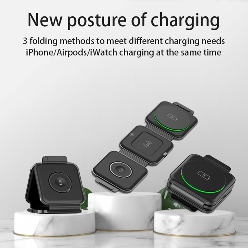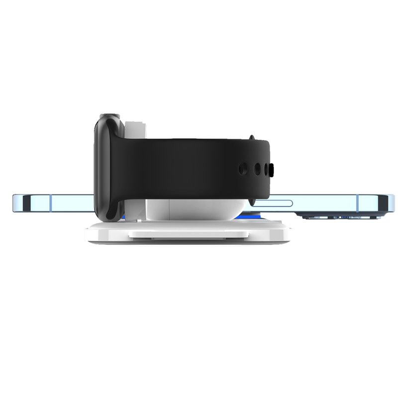 Denna trådlösa laddningsstation gör det enkelt att ladda upp till tre enheter samtidigt. Med stöd för snabbladdning och flera standarder är den perfekt för både mobiltelefoner och smarta klockor. Håll ordning på dina enheter och ladda dem snabbt och effektivt.