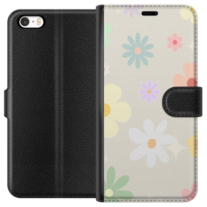 Plånboksfodral för iPhone 5s med fejdande blommor -design. Fodralet kombinerar stil och funktion – ett slitstarkt mobilskal som skyddar mot repor och stötar samt praktiska kortfack på insidan.