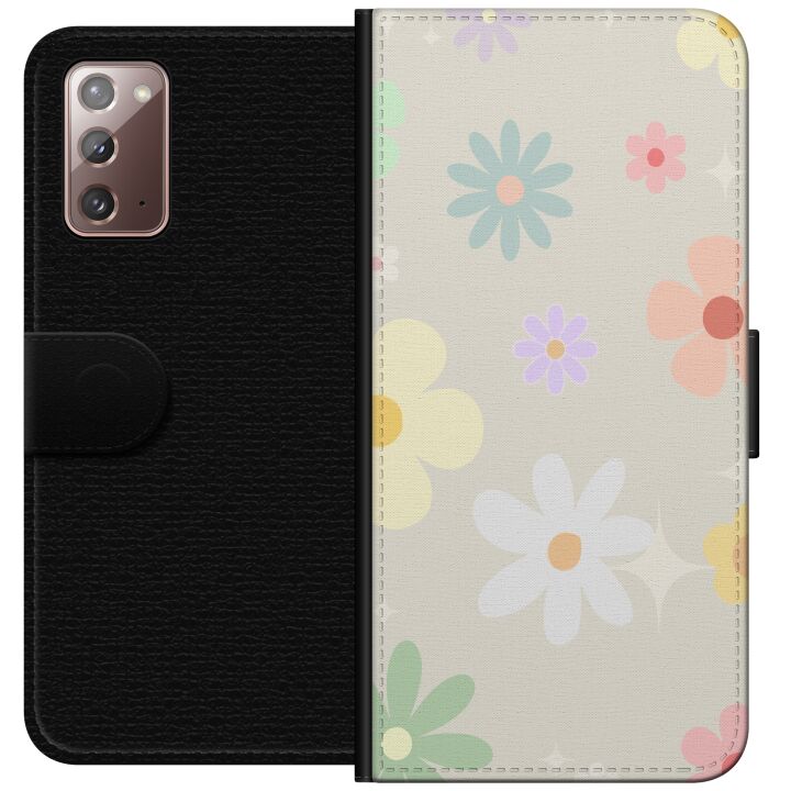 Plånboksfodral för Galaxy Note20 med fejdande blommor -design. Fodralet kombinerar stil och funktion – ett slitstarkt mobilskal som skyddar mot repor och stötar samt praktiska kortfack på insidan.