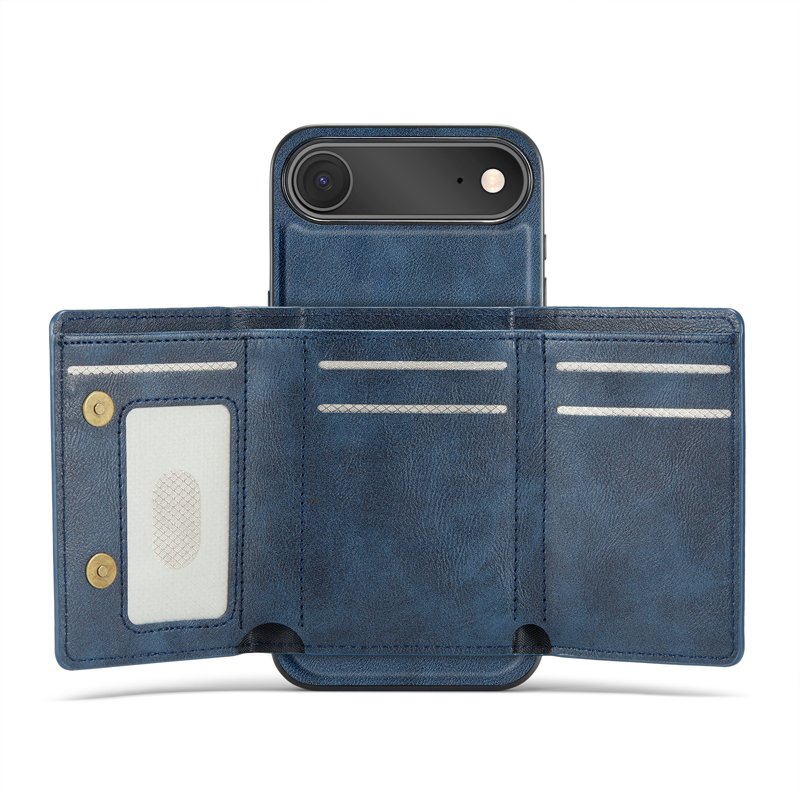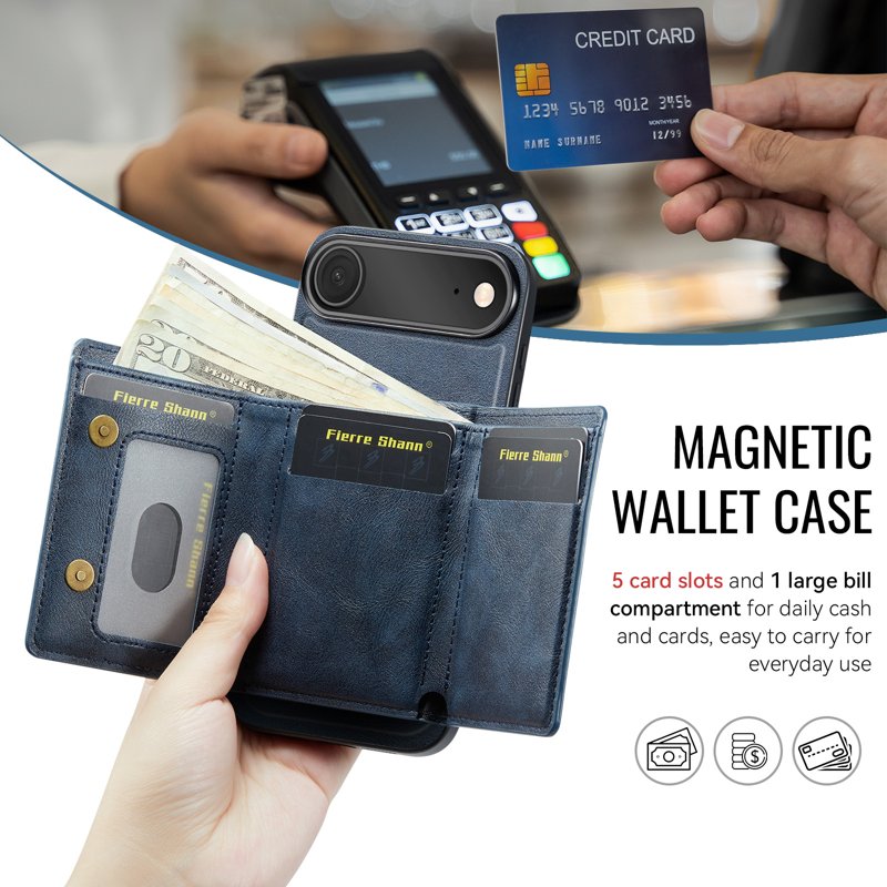 - Magnetisk plånboksfunktion: Inkluderar en avtagbar tri-fold plånbok med flera kortfack, en sedelficka och myntförvaring för att hålla dina nödvändigheter organiserade och säkra.