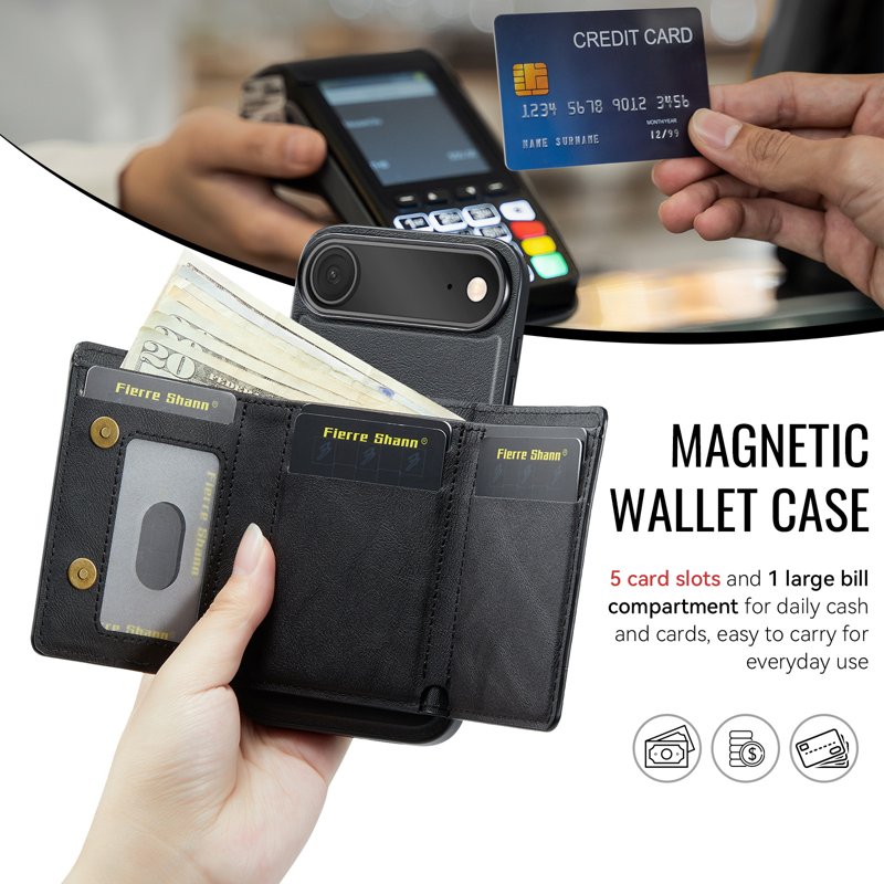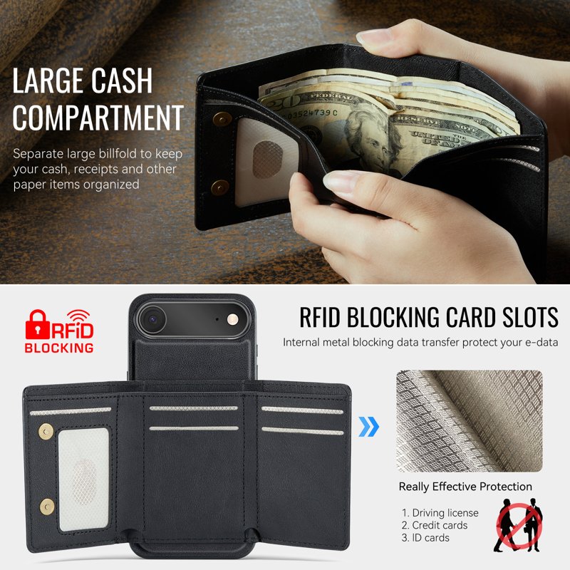 - Magnetisk plånboksfunktion - Inkluderar en avtagbar tri-fold plånbok med flera kortfack, en sedelplats och myntförvaring för att hålla dina nödvändigheter organiserade och säkra.