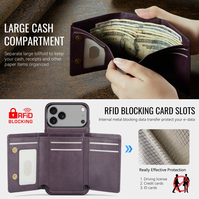- Magnetisk plånboksfunktion: Inkluderar en avtagbar tri-fold plånbok med flera kortfack, en sedelplats och myntförvaring för att hålla dina nödvändigheter organiserade och säkra.