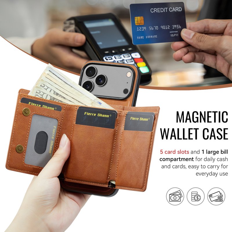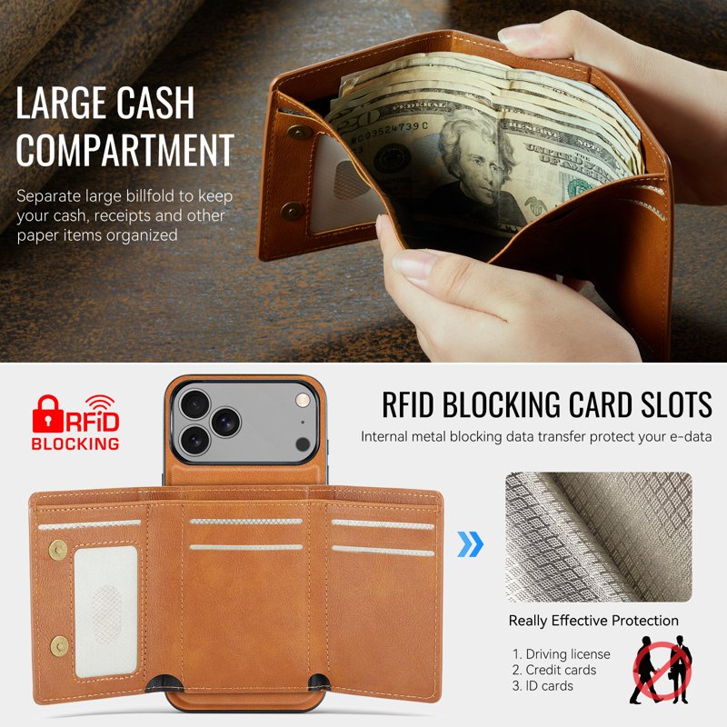 - Magnetisk plånboksfunktion: Innehåller en avtagbar tri-fold plånbok med flera kortfack, en sedelficka och myntförvaring för att hålla dina nödvändigheter organiserade och säkra.