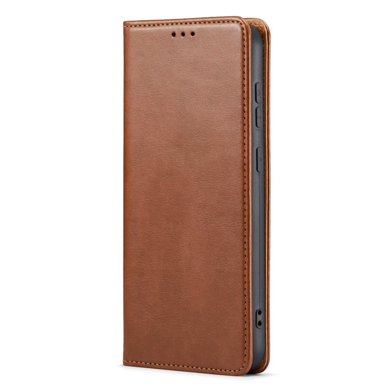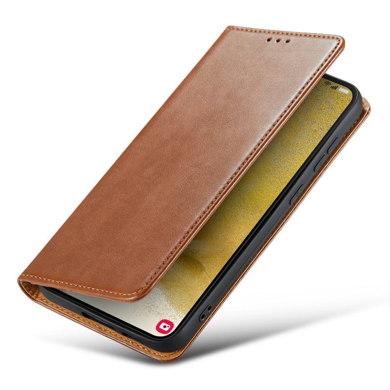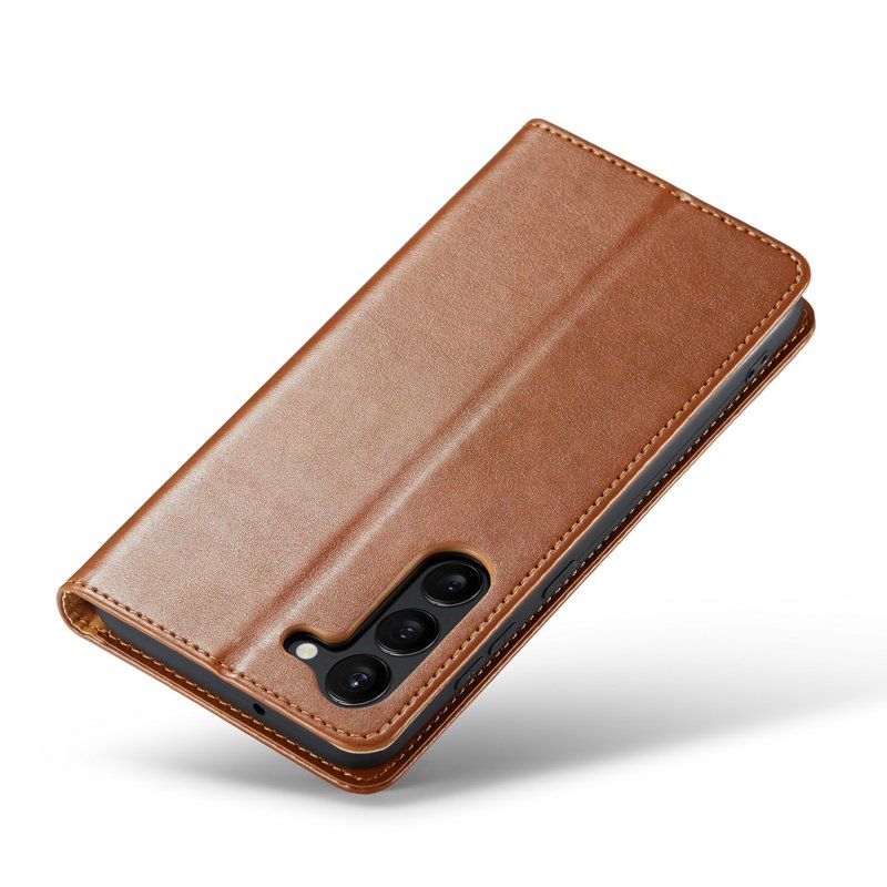 FIERRE SHANN Samsung Galaxy S24 fodral i brun PU läder erbjuder både stil och skydd för din telefon. Det yttre lagret av högkvalitativt PU läder och det mjuka TPU-inre skyddar effektivt mot dagliga skador. Med två kortfack och en sedelplats håller du dina kort och kontanter organiserade.