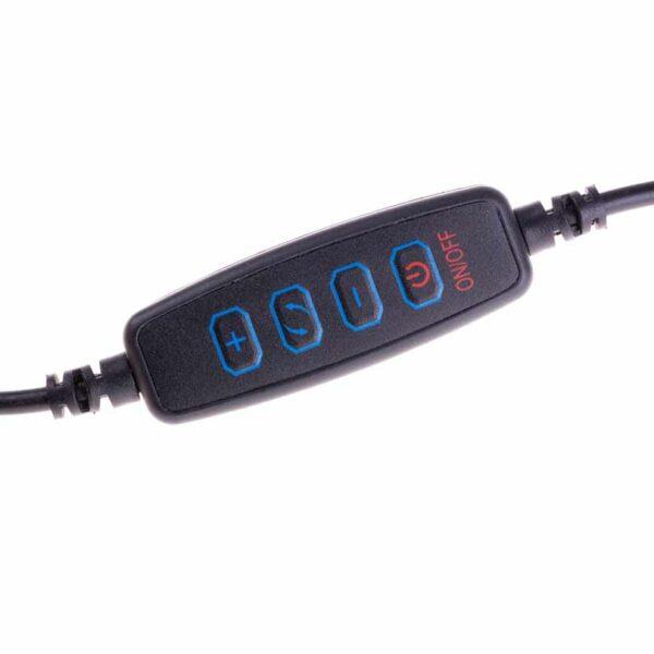 Stativets största fördel är ljusringen med 120 lysdioder och justerbar lutning. USB-strömkabeln innehåller en fjärrkontroll med tre temperaturlägen och tio ljusstyrkanivåer för att ställa in den perfekta belysningen. Den 5-8,8 cm breda telefonklämman med flexibel arm placeras mitt på ljusringen.