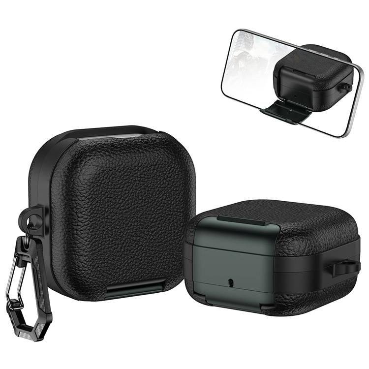Fodral för Samsung Galaxy Buds 4/Buds 4 Pro med Stativ Litchi Texture TPU + PC Hörlursfodral med Lås och Karbinhake - Svart/Armégrön