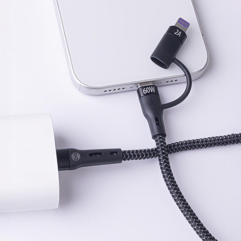 Med USB-C till USB-C-anslutning stöder kabeln laddning av enheter med upp till 60W effekt, och 2-i-1-funktionen gör det enkelt att växla mellan USB-C och Lightning-kontakter, vilket gör kabeln kompatibel med ett brett utbud av enheter. Perfekt för daglig användning, både hemma och på resande fot.
