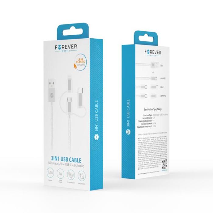 Forever 3-i-1 kabeln är ett praktiskt och mångsidigt tillbehör som passar perfekt för personer som använder olika enheter med olika laddningsportar. Med dess universella kompatibilitet och pålitliga prestanda är den ett oumbärligt tillbehör för hemmet, kontoret eller när du är på språng.