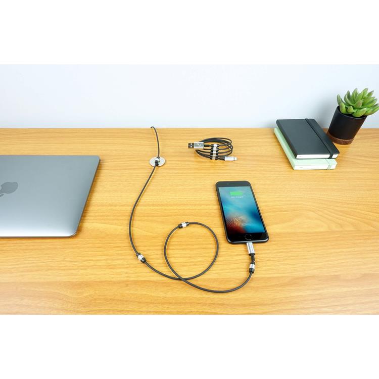 Frustrationen med kabelhantering är nu glömd. Säg adjö till trassliga och försvunna kablar med den nya magnetiska Rivet-teknologin som avslutar krånglet med att hålla kablarna organiserade och på plats. Rulla ihop RIVET CHARGE i en bärbar slinga med en enkel sammanfogning av nitarna eller koppla endast bort den kabellängd som du behöver använda. Du kan också använda den medföljande RIVET-skivan på skrivbordet för att förhindra kabeln från att falla när den inte är ansluten.