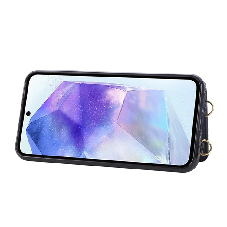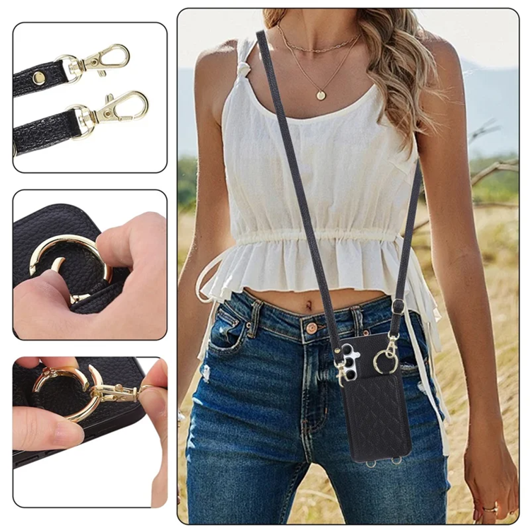 Galaxy A17 5G/4G Mobilskal Korthållare Kickstand Rhombus Läder TPU med Axelrem - Svart