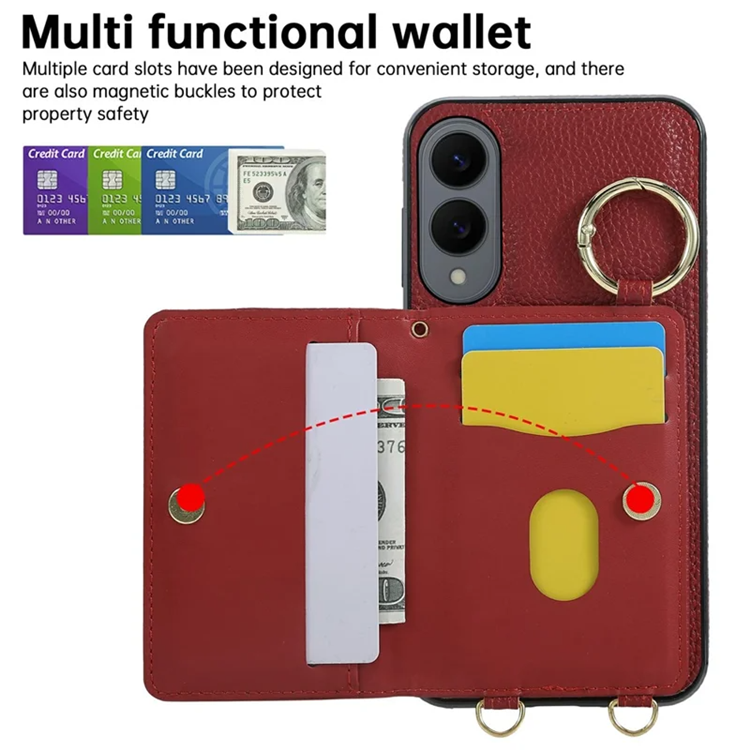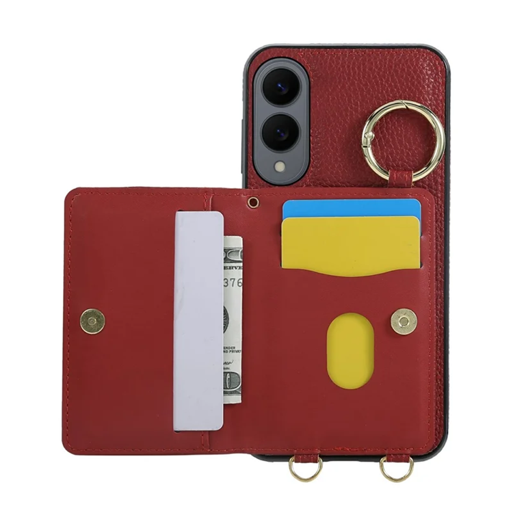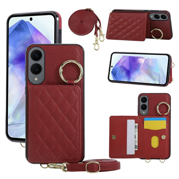 Galaxy S25 Edge Mobilskal Korthållare Kickstand Rhombus Läder TPU med Axelrem - Röd