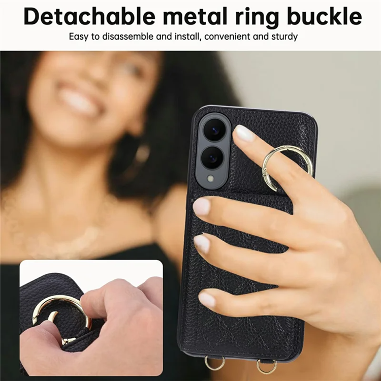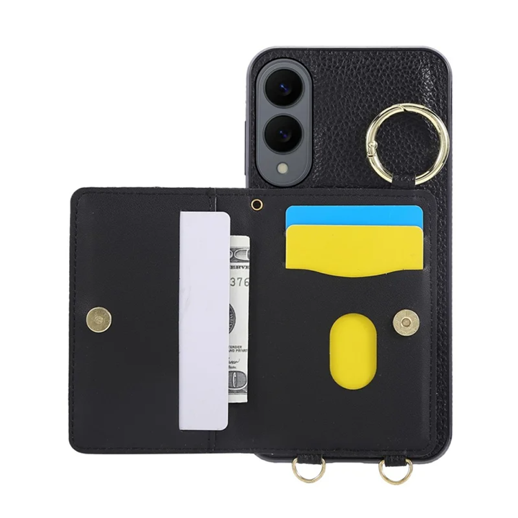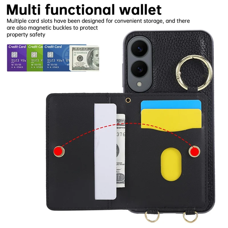 Galaxy S25 Edge Mobilskal Korthållare Kickstand Rhombus Läder TPU med Axelrem - Svart