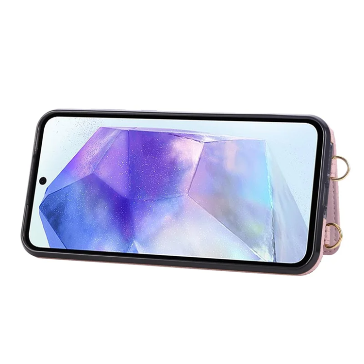 Galaxy S25 / S24 Mobilskal Korthållare Kickstand Rhombus Läder TPU med Axelrem - Rosa