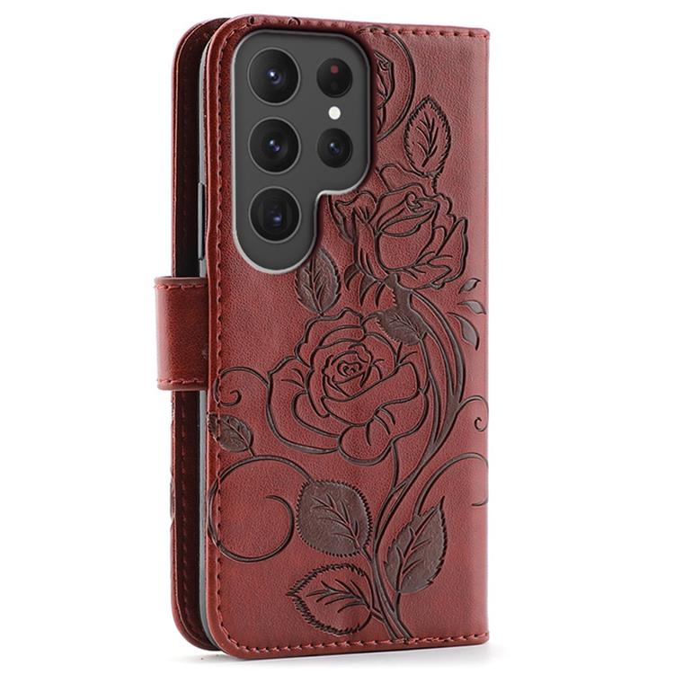 Galaxy S25 Ultra Plånboksfodral Imprinted Rose Butterfly PU Läder - Brun