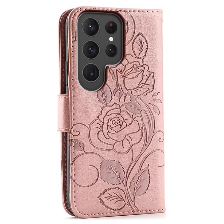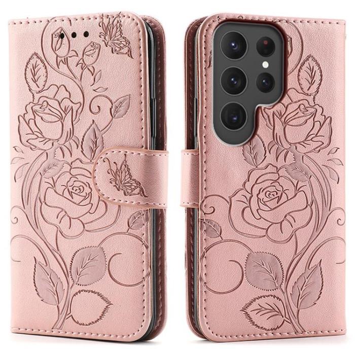 Galaxy S25 Ultra Plånboksfodral Imprinted Rose Butterfly PU Läder - Roséguld