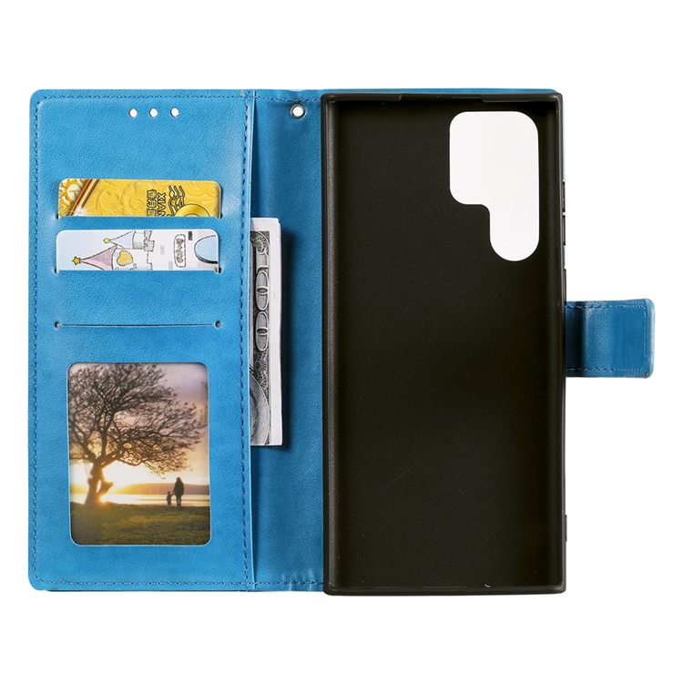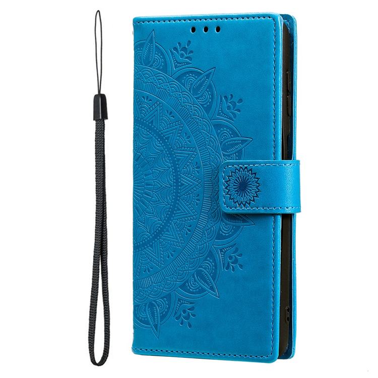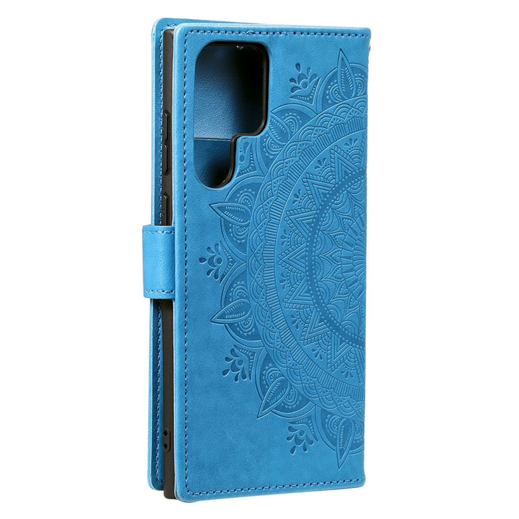 Galaxy S26 Ultra Plånboksfodral Imprinted Totem Läder med Handleds Rem - Blå
