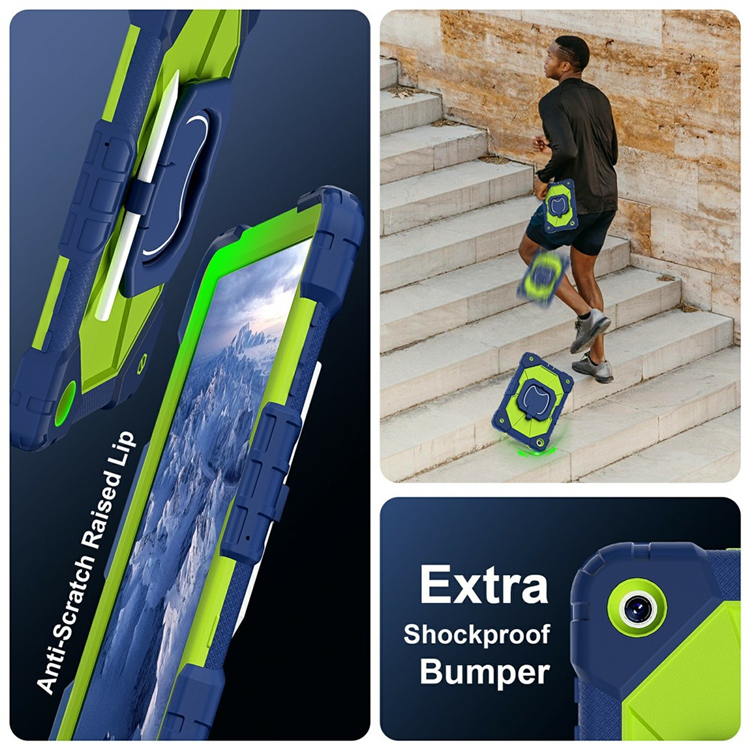 Tillverkat av högkvalitativt silikon och PC-material ger fodralet ett överlägset skydd mot stötar, repor och fall. Den förstärkta ramen absorberar kraften vid stötar och håller din surfplatta säker, medan det inbyggda stället gör det enkelt att titta på filmer, läsa eller arbeta handsfree. Med ett 360° roterbart handtag får du stabilt grepp, och tack vare axelremmen kan du bära surfplattan smidigt och bekvämt över axeln. Dessutom finns ett sidofack för din penna – perfekt för dig som är kreativ eller alltid i farten.