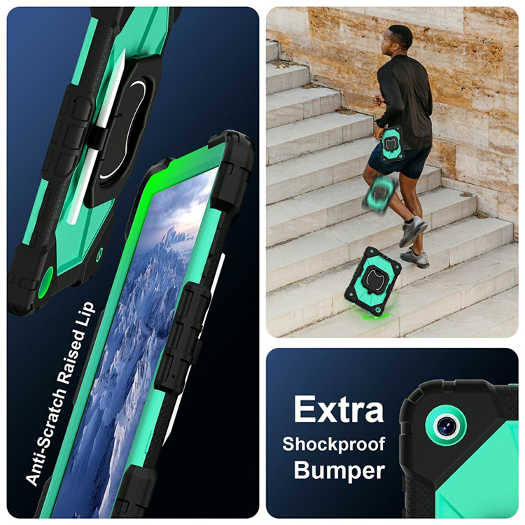 Tillverkat av högkvalitativt silikon och PC-material ger fodralet ett överlägset skydd mot stötar, repor och fall. Den förstärkta ramen absorberar kraften vid stötar och håller din surfplatta säker, medan det inbyggda stället gör det enkelt att titta på filmer, läsa eller arbeta handsfree. Med ett 360° roterbart handtag får du stabilt grepp, och tack vare axelremmen kan du bära surfplattan smidigt och bekvämt över axeln. Dessutom finns ett sidofack för din penna – perfekt för dig som är kreativ eller alltid i farten.