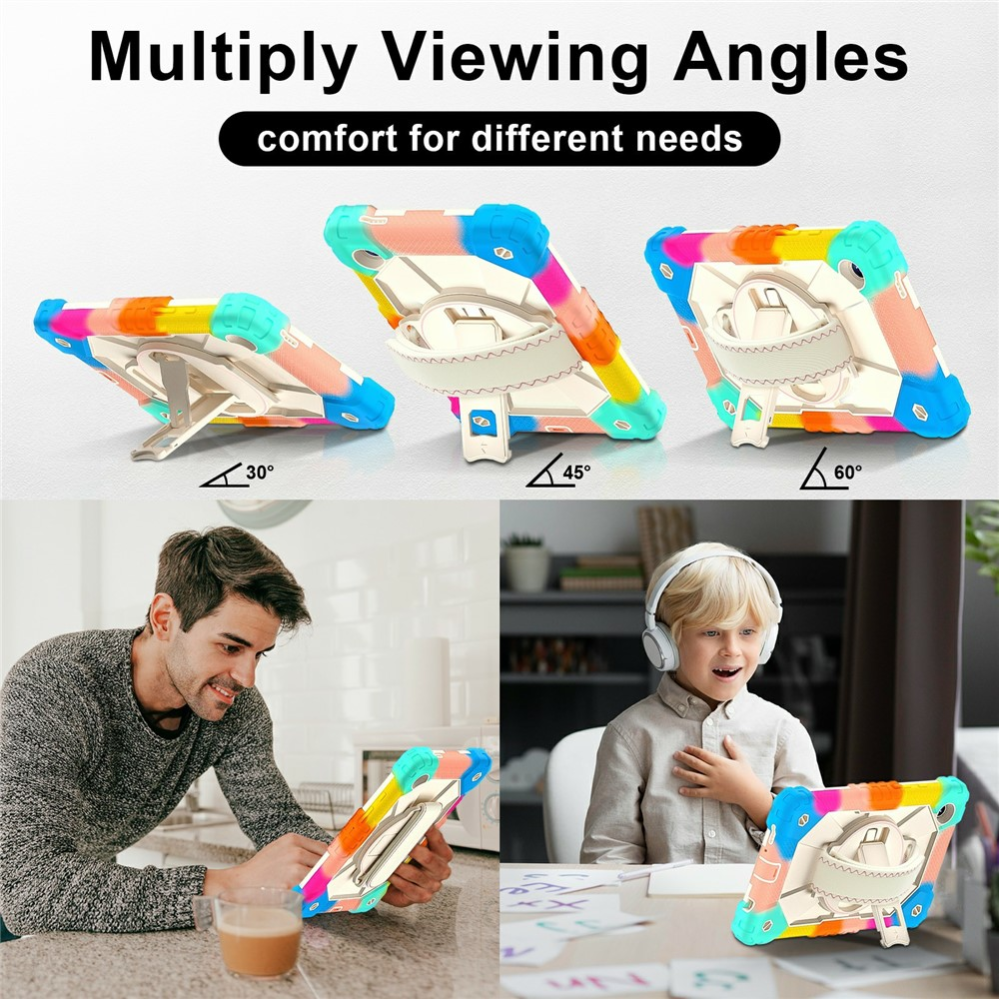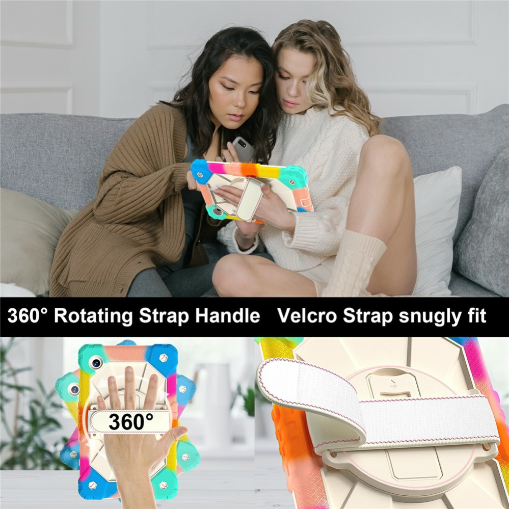 Tillverkat av högkvalitativt silikon och PC-material ger fodralet ett överlägset skydd mot stötar, repor och fall. Den förstärkta ramen absorberar kraften vid stötar och håller din surfplatta säker, medan det inbyggda stället gör det enkelt att titta på filmer, läsa eller arbeta handsfree. Med ett 360° roterbart handtag får du stabilt grepp, och tack vare axelremmen kan du bära surfplattan smidigt och bekvämt över axeln. Dessutom finns ett sidofack för din penna – perfekt för dig som är kreativ eller alltid i farten.