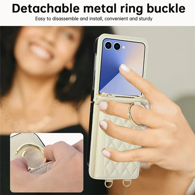 Galaxy Z Flip 7 5G Mobilskal Korthållare Kickstand Rhombus Läder TPU med Axelrem - Beige