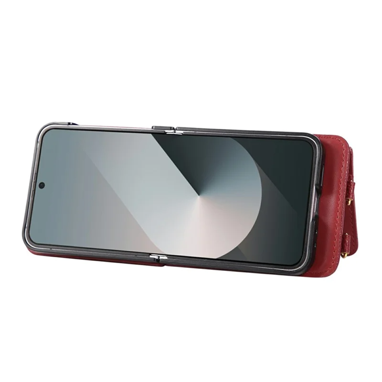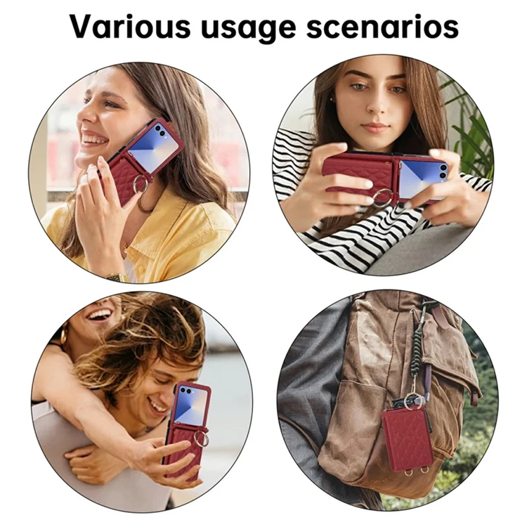 Galaxy Z Flip 7 5G Mobilskal Korthållare Kickstand Rhombus Läder TPU med Axelrem - Röd
