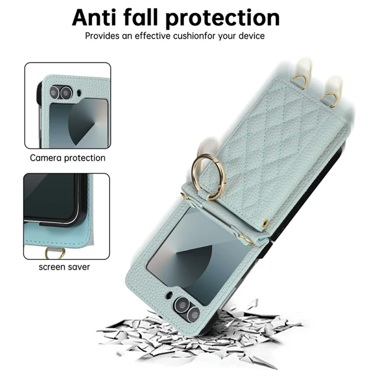Galaxy Z Flip 7 FE / Z Flip 6 Mobilskal Korthållare Kickstand Rhombus Läder TPU med Axelrem -  Blå