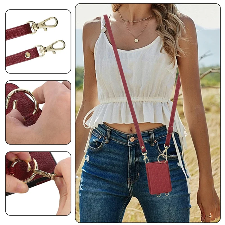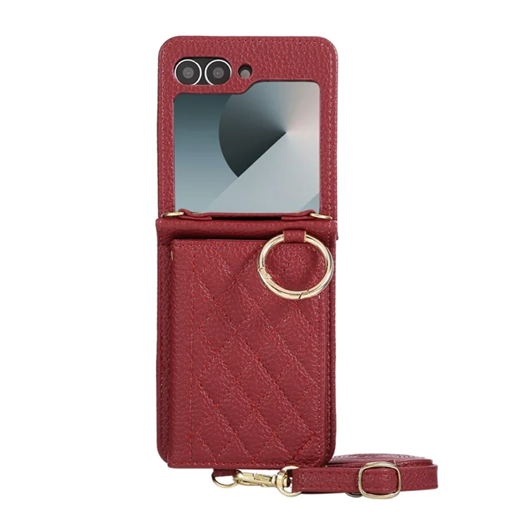 Galaxy Z Flip 7 FE / Z Flip 6 Mobilskal Korthållare Kickstand Rhombus Läder TPU med Axelrem - Röd