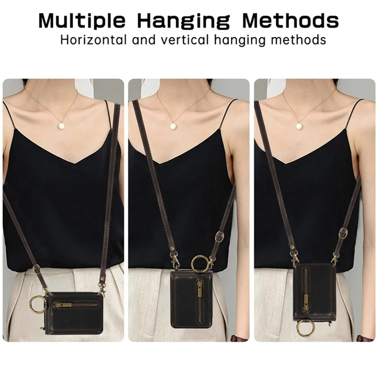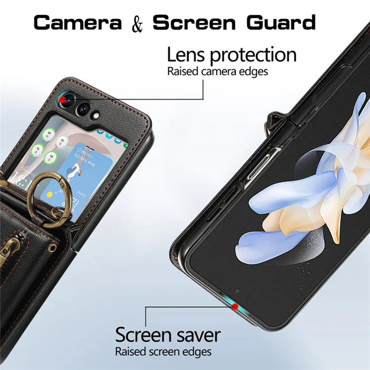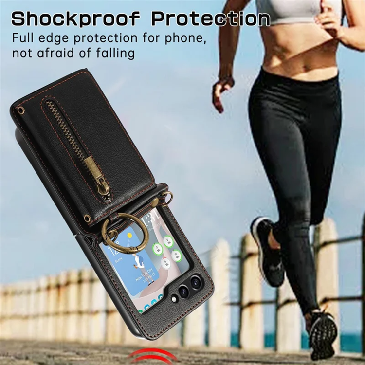 Galaxy Z Flip 7 Plånboksfodral Läder Zipper Kickstand med Axelrem - Svart