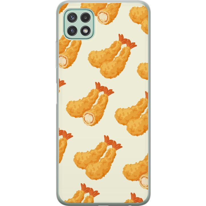 Ett genomskinligt mobilskal för Galaxy A22 5G med ett trendigt Räkor tryck på baksidan. Skalet har en perfekt passform som skyddar din telefon mot repor, damm och smuts samtidigt som designen gör mobilen mer personlig.