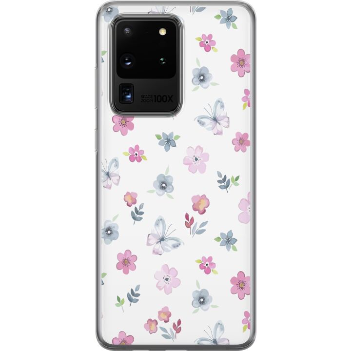 Ett genomskinligt mobilskal för Galaxy S20 Ultra med ett trendigt Blommor och fjärillar tryck på baksidan. Skalet har en perfekt passform som skyddar din telefon mot repor, damm och smuts samtidigt som designen gör mobilen mer personlig.