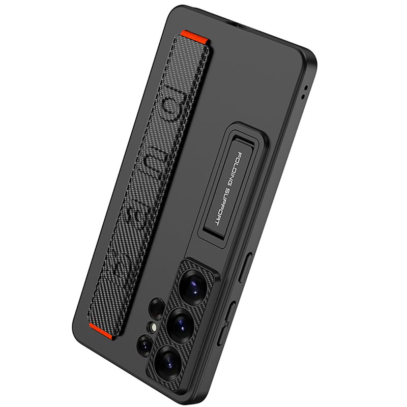 - Handbandet möjliggör säker enhandshållning och fungerar även som kickstand för handsfree-visning.