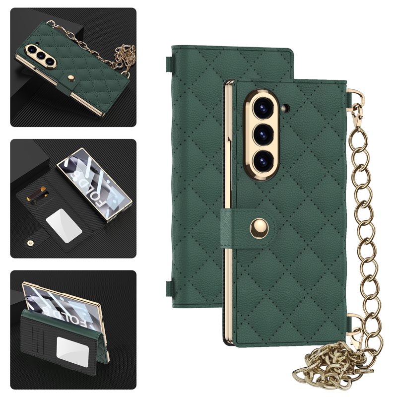Upptäck GKK Samsung Galaxy Z Fold6 Fodral i äkta läder. Detta eleganta fodral erbjuder både stil och skydd. Med sin mörkgröna färg och quiltade design är det perfekt för den moderna användaren. Fodralet är utformat för att skydda din enhet samtidigt som det ger praktiska funktioner för din vardag.