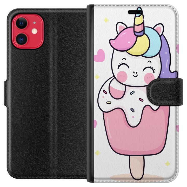 Plånboksfodral för iPhone 11 med Glad enhörning -design. Fodralet kombinerar stil och funktion – ett slitstarkt mobilskal som skyddar mot repor och stötar samt praktiska kortfack på insidan.