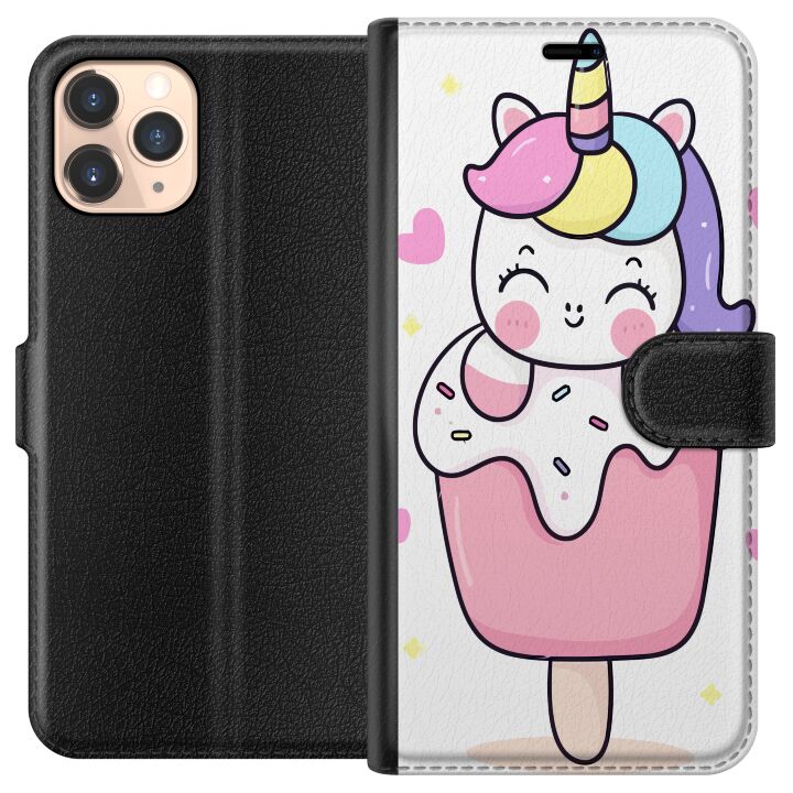 Plånboksfodral för iPhone 11 Pro med Glad enhörning -design. Fodralet kombinerar stil och funktion – ett slitstarkt mobilskal som skyddar mot repor och stötar samt praktiska kortfack på insidan.